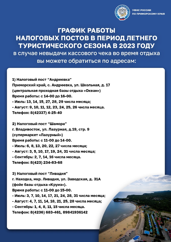 УФНС России по Приморскому краю отмечает: обратиться за помощью к налоговикам смогут граждане, которым, к примеру, не выдали кассовый чек за оказание услуг, а также которым необходима консультация о требованиях законодательства в части применения ККТ. Налоговые посты расположены в селе Андреевка, посёлке Ливадия и в бухте Лазурная (Шамора).