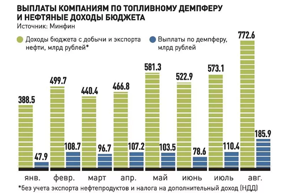 Это особенно бросается в глаза, поскольку сейчас цены на бензин и дизель растут темпами, далеко опережающими инфляцию, а традиционно принято винить в подорожании топлива именно нефтяные компании. С другой стороны, в августе они обеспечили приход в казну 745,8 млрд рублей (рекорд для этого года) только с одного налога на добычу полезных ископаемых (НДПИ). Причем относительно июля приход в бюджет по НДПИ вырос на 192 млрд рублей, а выплаты нефтяникам - лишь на 75,5 млрд. А ведь из отрасли в казну платятся еще экспортные пошлины за нефть и нефтепродукты, а также ежеквартально выплачивается налог на дополнительный доход (НДД).