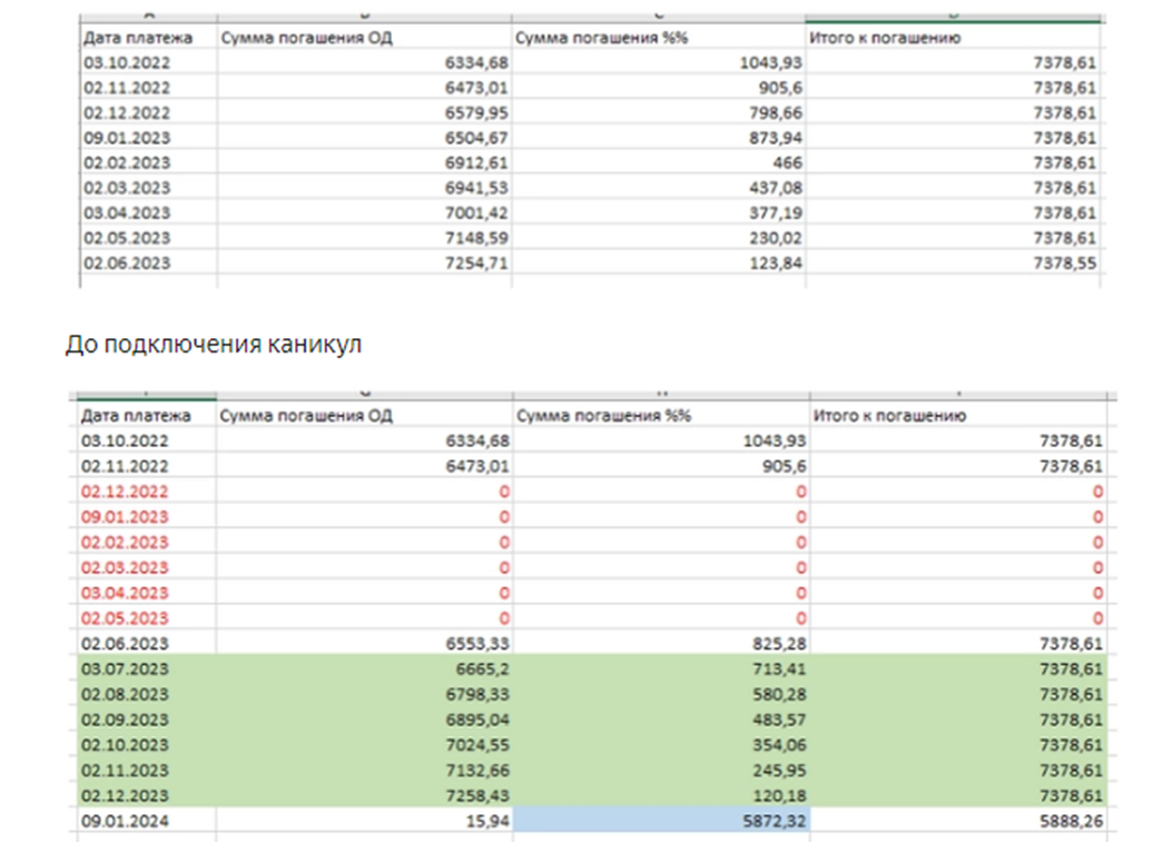 В течении кредитных каникул, заемщик имеет право вносить денежные средства в любое время и в любом размере по своему усмотрению и желанию, что позволяет уменьшить общий размер основного долга и снизить общей размер переплаты по кредиту за счёт меньшего размера начисленных процентов за пользование. Если ваша ситуация не попадает под Федеральные законы, вы можете обратиться к своему кредитору для уточнения у него вариантов собственных программ по снижению финансовой нагрузки, при этом не стоит ждать когда будет пропущен ежемесячный платеж по кредиту, и обратиться к кредитору заблаговременно. Как платить до и после кредитных каникул?Первый график — до подключения каникул, второй график — после подключения каникул (привожу пример расчета по 106-ФЗ).