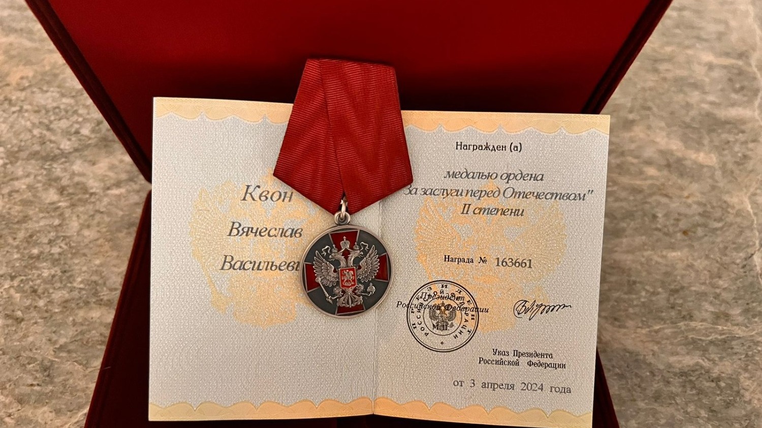 Ранее «Восток-Медиа» писало, что в апреле этого года был официально опубликован указ президента России Владимира Путина о награждении Вячеслава Квона медалью ордена «За заслуги перед Отечеством II степени».