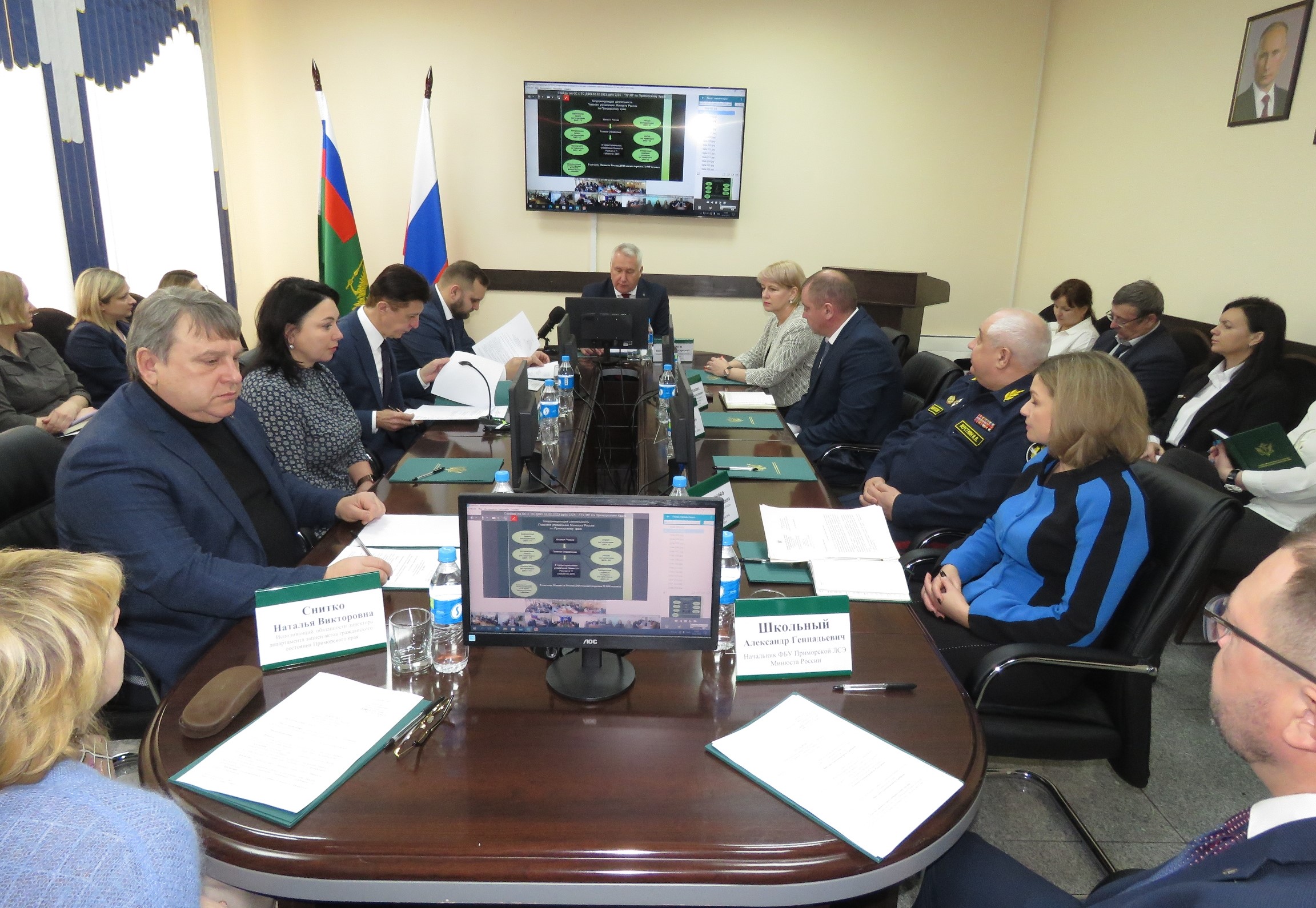 В совещании приняли участие руководители территориальных органов, представитель аппарата полномочного представителя Президента Российской Федерации в Дальневосточном федеральном округе, уполномоченные по правам человека в Приморском крае, руководители подведомственных Минюсту России служб и учреждений, юридических корпораций, органов записи актов гражданского состояния. Всего в режиме видеоконференцсвязи приняло участие 90 человек.