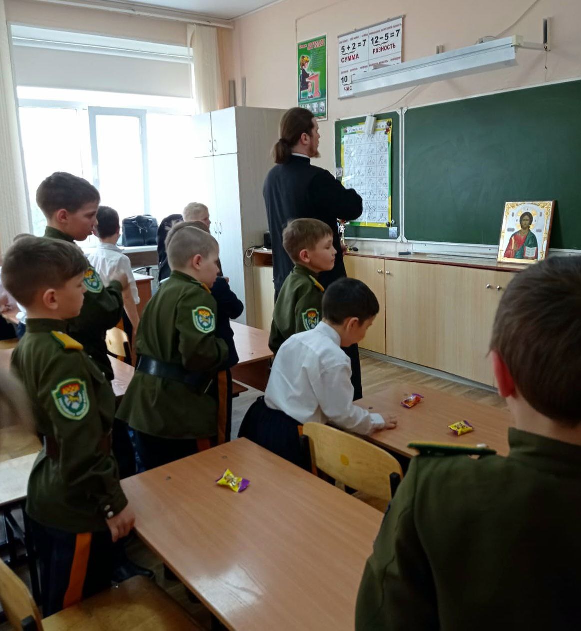 7 апреля в МОБУ СОШ №10 г. Арсеньева прошло очередное занятие иерея Димитрия Овчинникова с учащимися 1-го и 2-го класса казачьей направленности, воспитанниками Даубихинской станицы.