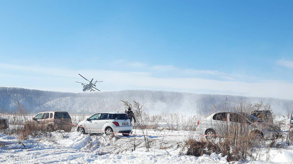 Боевой вертолёт пролетел недалеко от участников снежного джип-спринта в Приморье