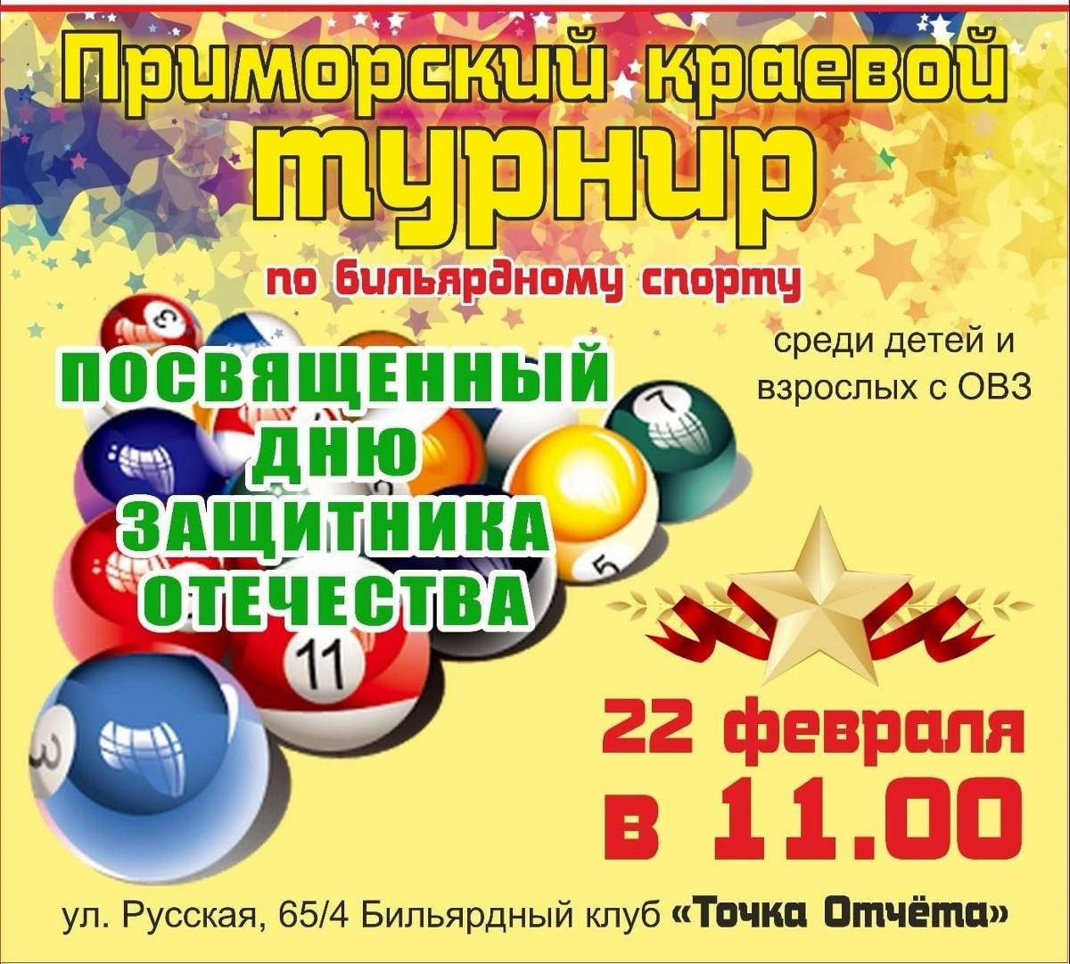В канун Дня защитника Отечества в Приморской столице состоится открытый турнир Приморского края по бильярдному спорту среди детей и взрослых с ограниченными возможностями здоровья.