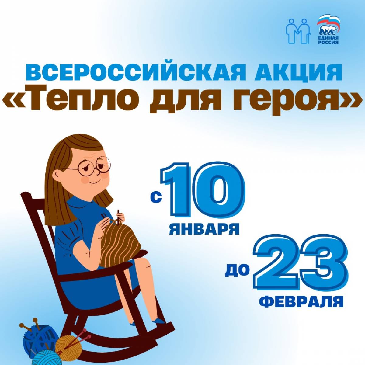Всероссийская акция «Тепло для героя» стартовала в рамках направления «Долголетие для всех» мобилизационного партийного проекта «Старшее поколение». Ее участники подготовят ко Дню защитника Отечества письма со словами поддержки и теплый подарок, связанный своими руками для российских военнослужащих.