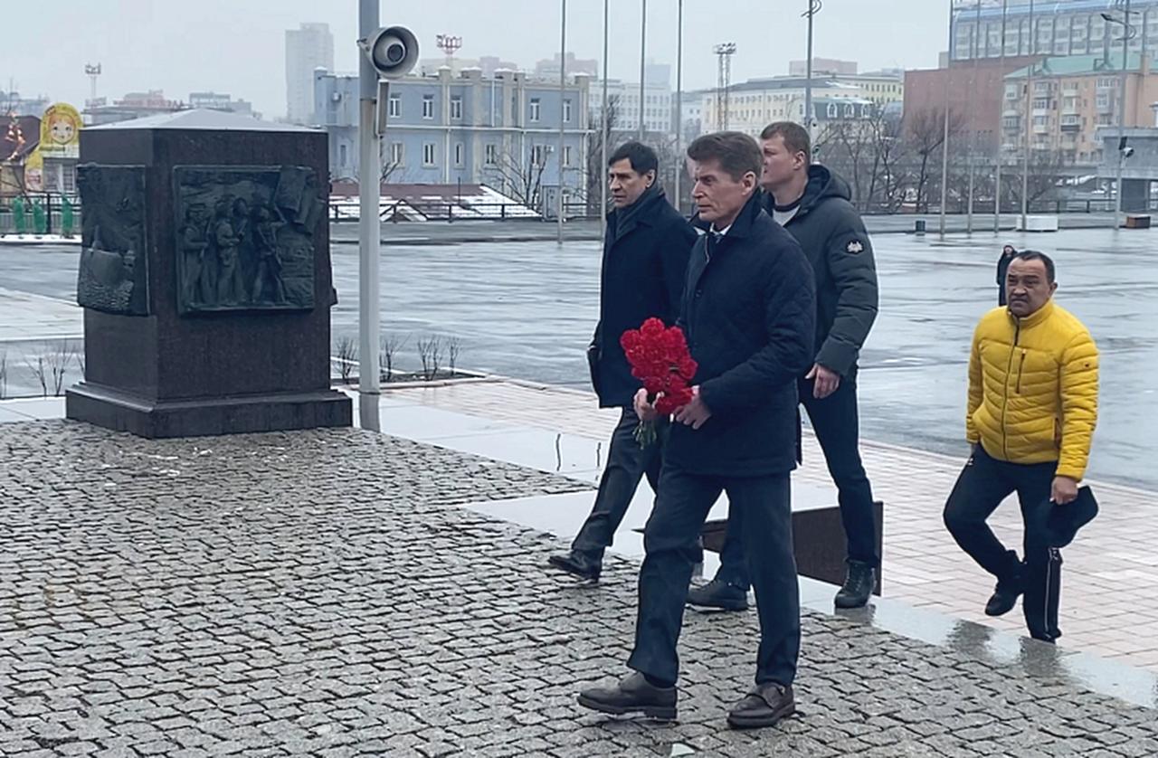 Вместе с жителями города цветы к стеле «Владивосток — город воинской славы» возложили Губернатор Приморского края Олег Кожемяко, глава города Владивостока Константин Шестаков, председатель Думы города,
