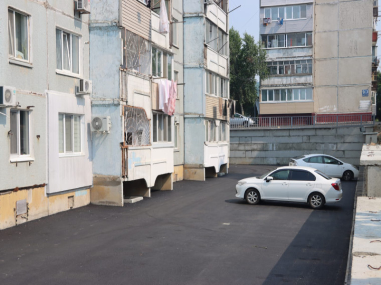 Подрядная организация выполнила замену старого дворового покрытия, установила бордюрный камень и оборудовала водоотведение. Также строители увеличили площадь придомовой парковочной зоны.