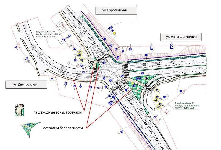 Для безопасности пешеходов появятся тротуары и наземные пешеходные переходы, на пересечении улиц Анны Щетининой, Днепровская и Бородинская - два островка безопасности, через которые будет организовано непрерывное пешеходное пространство.