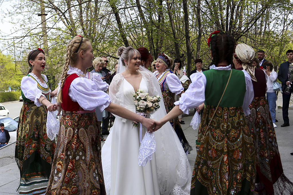 Приятным сюрпризом для виновников торжества и их гостей стал творческий подарок от вокального коллектива «Приморочка». Участницы ансамбля исполнили традиционные песни, провели шуточные свадебные игры и обряды.