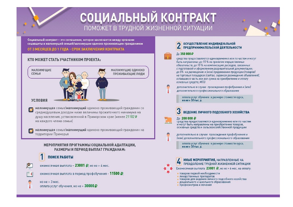 Если Ваш среднедушевой доход и/или доход Вашей семьи по не зависящим от Вас причинам ниже величины прожиточного минимума на душу населения, установленной в Приморском крае предлагаем рассмотреть возможность получения государственной социальной помощи на основании социального контракта.