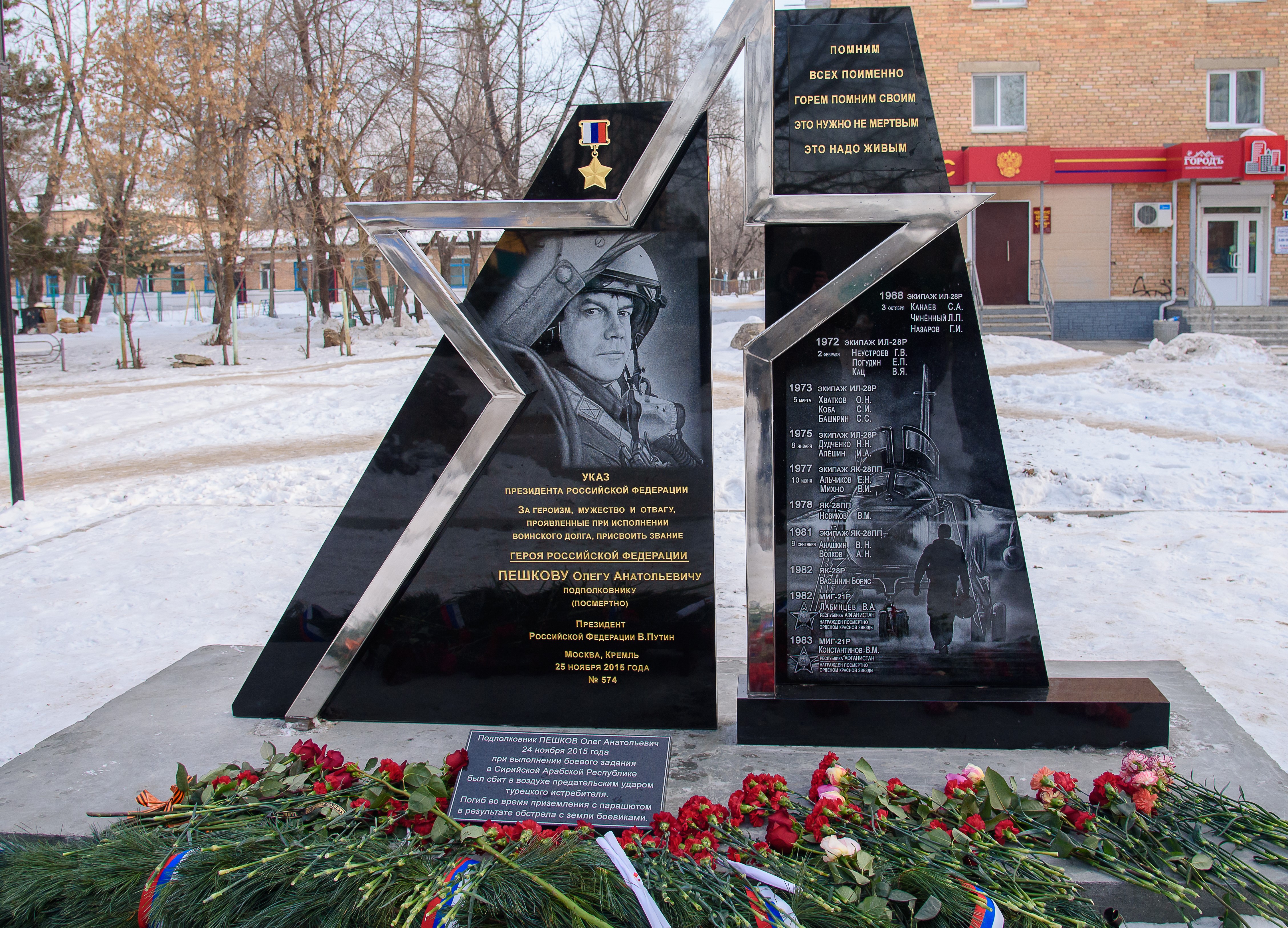 В 11.30 состоится церемония возложения цветов к памятнику Героя России подполковника О.А. Пешкова.