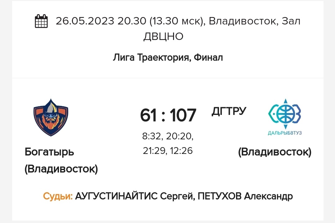 Блестящей победой в финале над "Богатырем" 107:61 (32:8, 20:20, 29:21, 26:12) завершили краевой турнир МЛБЛ наши баскетболисты. На пути к заслуженному титулу команда Дальрыбвтуза не проиграла ни одной встречи, одержав 23 победы подряд (12 в круговом предварительном турнире, 7 в круговом финальном турнире и 4 на стадии плей-офф). В заключительной игре наши спортсмены с самого начала ушли в отрыв, завершив первую четверть с перевесом в 24 очка. В дальнейшем команда Дальрыбвтуза только наращивала свое преимущество, доведя его к финальной серене до 46 очков. Все ребята играли с полной отдачей и заслуживают наших слов благодарности, как и их тренер - Артур Кудинов. Особо хочется отметить магистранта Института рыболовства и аквакультуры Романа Бричалова и студента того же института Никиту Аракчеева, набравших в финальной игре 24 и 22 очка, соответственно. Ждём такой же искрометной игры от наших баскетболистов теперь на первенстве МЛБЛ Дальневосточного федерального округа, которое пройдёт с 10 по 12 июня в Хабаровске. Болеем за команду Дальрыбвтуза!