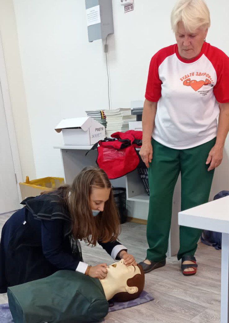Учит ребят полезным навыкам Чёрных Наталья — врач-терапевт центра медицинской профилактики, заслуженный врач РФ, сертифицированный тренер от Красного Креста по оказанию первой помощи.
