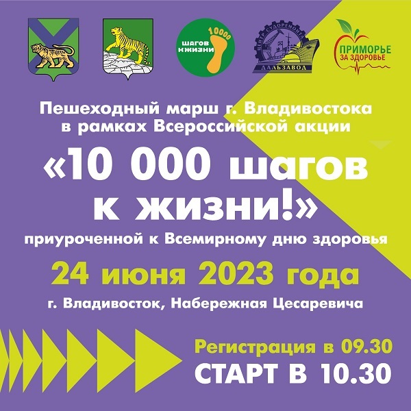 Жители и гости Приморья смогут 24 июня принять участие во Всероссийской акции «10 тысяч шагов к жизни». Это уникальная возможность выйти на прогулку со всей страной, пополнить запасы здоровья, получить заряд бодрости и прививку хорошего настроения. Во Владивостоке - помимо пешего похода, всех участников ждет насыщенная праздничная программа. Несмотря на то, что акция состоится в День молодёжи, к участию приглашаются все желающие независимо от возраста, удовольствие получит каждый – от мала до велика, сообщает портал VladMedicina.ru.