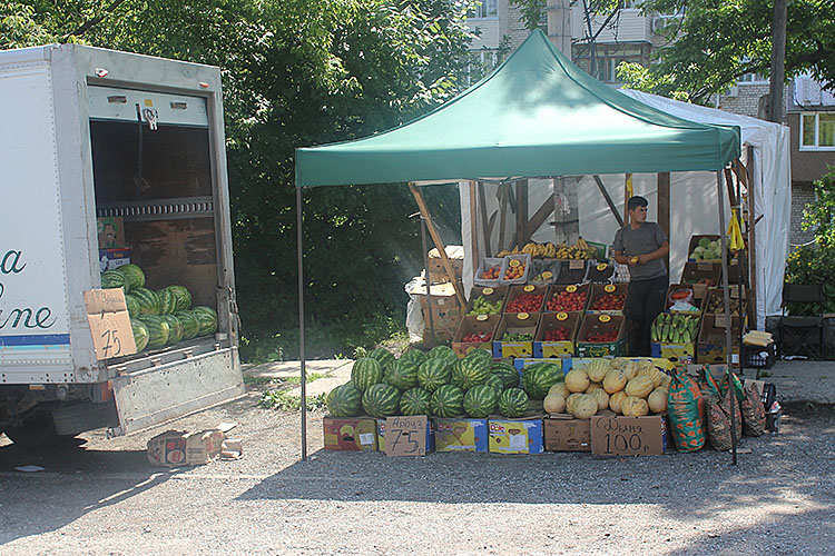 Также запрещено размещение продуктов вне торгового павильона на улице, так нарушается температурный режим их хранения. Исключение – крупные бахчевые культуры, но и они должны лежать не на расстеленных на обочине тентах или в сетках на земле, а на подтоварниках, скамьях, полках, в ящиках. Однако нередко торговцы устраивают возле своих ларьков стеллажи, ставят на землю поддоны с овощами и фруктами.