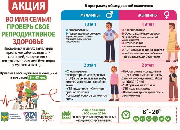 Акция «Во имя семьи. Проверь свое репродуктивное здоровье!», стартовавшая в Приморье, как раз и направлена на своевременное выявление признаков заболеваний или состояний, которые могут стать причиной бесплодия мужчин и женщин. Пройти обследование могут жители края в возрасте от 18 до 49 лет.