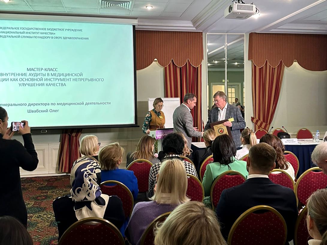Сертификат, подтверждающий добровольную сертификацию в сфере оказания качественной и безопасной медицинской деятельности, на сцене получил заведующий отделом управления качеством и безопасностью мед. деятельности нашего центра Алексей Прушинский.